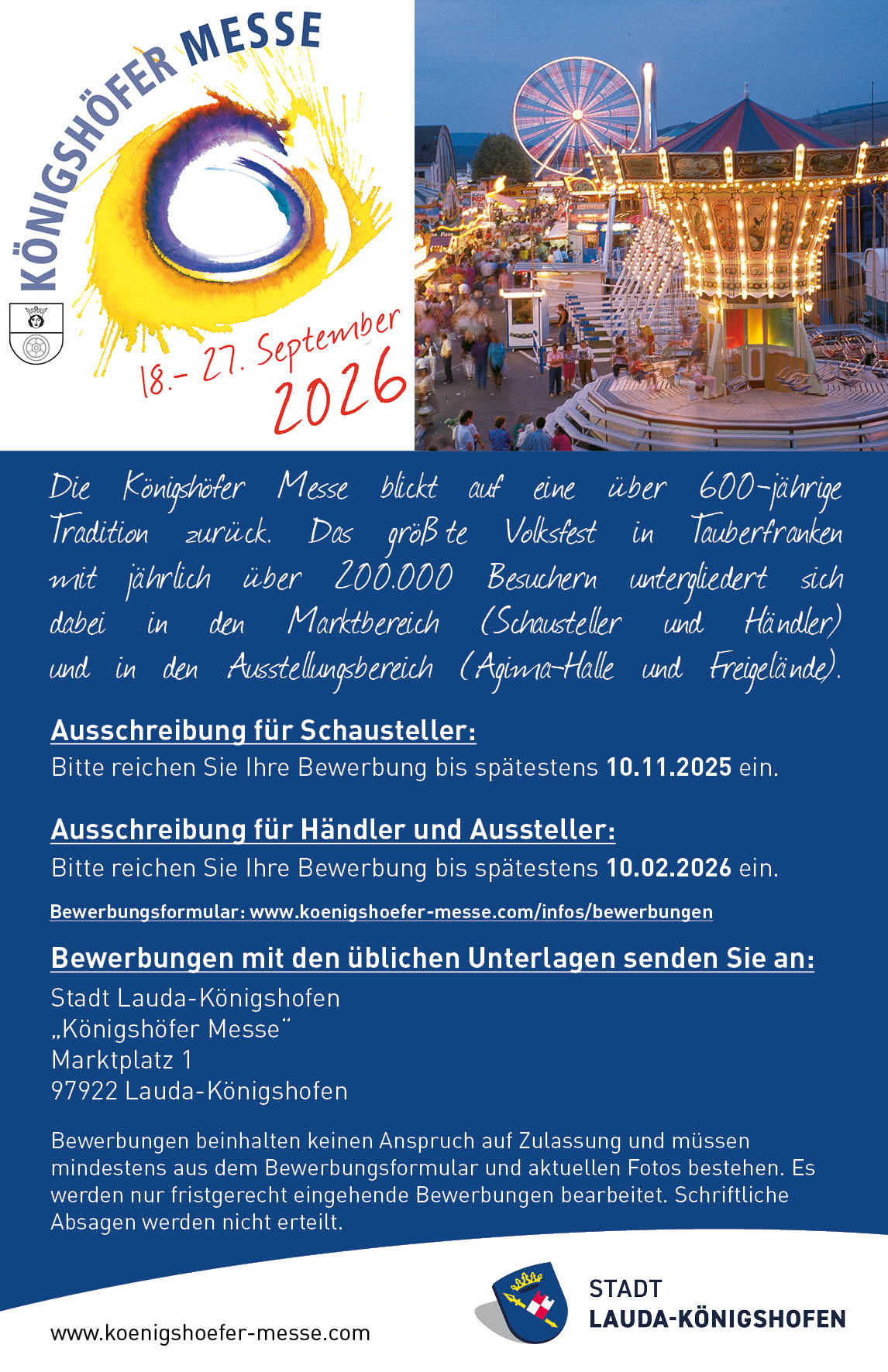 Das Ausstellungsfreigelände stellen wir ähnlich der Ausstellungshalle vorwiegend gewerbliche Handwerksbetrieben oder ähnlichem zur Verfügung. Die Eingangsfrist für Bewerbungen für die Königshöfer Messe 2026 endet am 10.02.2026. Alle danach eingehenden Bewerbungen können nicht mehr berücksichtigt werden. Durch das Einreichen der Bewerbungsunterlagen entsteht kein Rechtsanspruch auf Zuteilung eines Messestandes. Die Zuteilung des Messestandes erfolgt ausschließlich durch die Stadt Lauda-Königshofen.